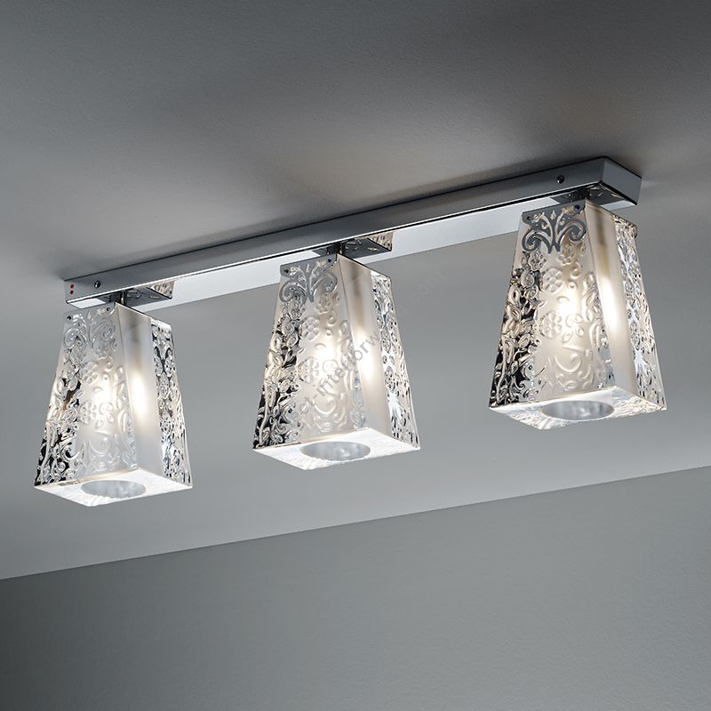 The Vicky ceiling lamp is available with one or three light fittings. The diffuser is in decorated crystal and the structure in polished chrome. The lamp is suitable for both modern but also classic environments thanks to its universal and sophisticated design. It is excellent in the living area of the home, in the bathroom in a hotel or shop.