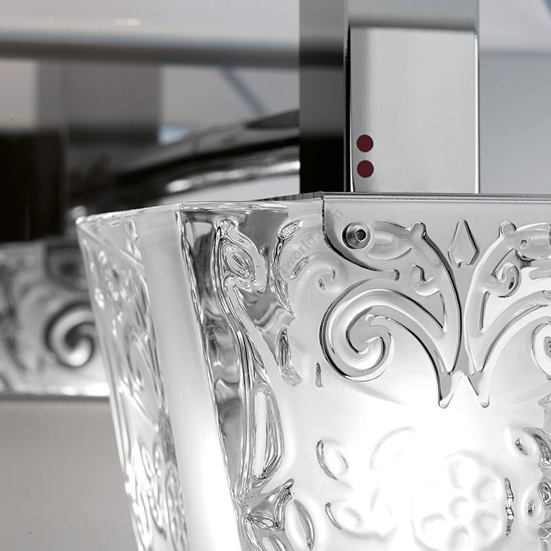 The collection is in chrome and crystal, a blend between technology, art and design. This collection has strikingly modern lines and technological solutions and shows real craftsmanship in the production of the crystal elements”.