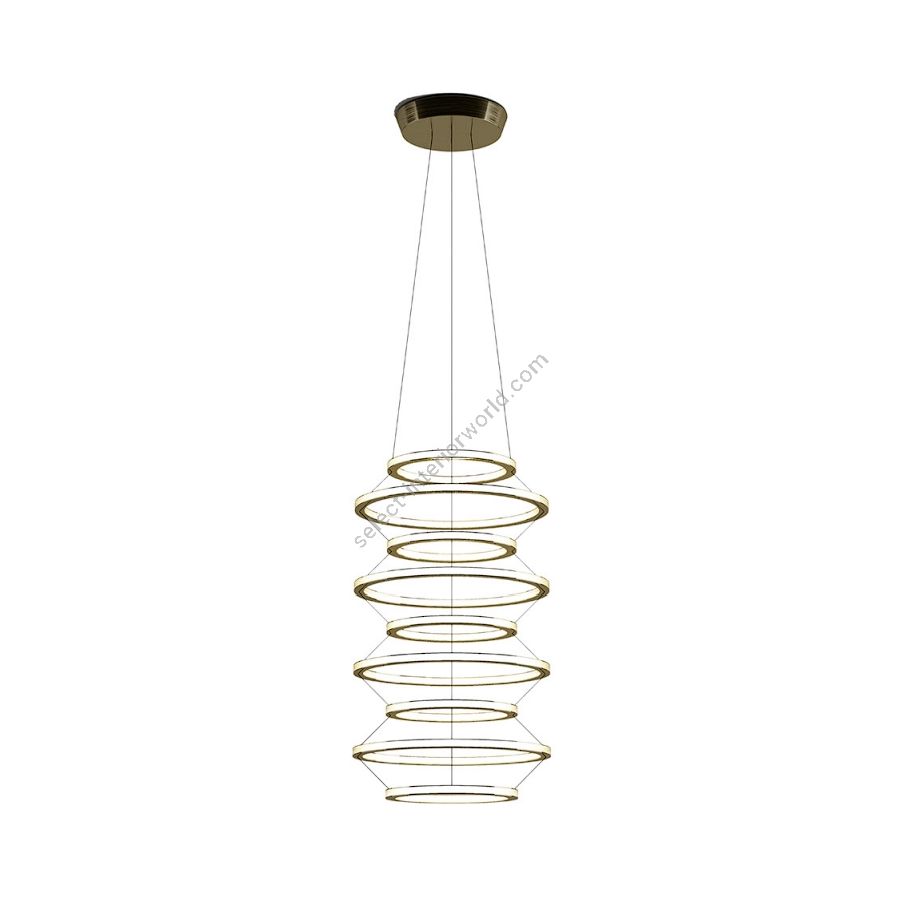 The set of suspension luminaires is a work composed of metal rings, adorned with brass details. Each ring contains an opaline acrylic diffuser both on the outside and inside, allowing for uniform diffusion of a warm, integrated LED light source. This meticulous composition offers exceptional versatility: by combining the five different ring diameters, a wide range of possible volumes and shapes are displayed.