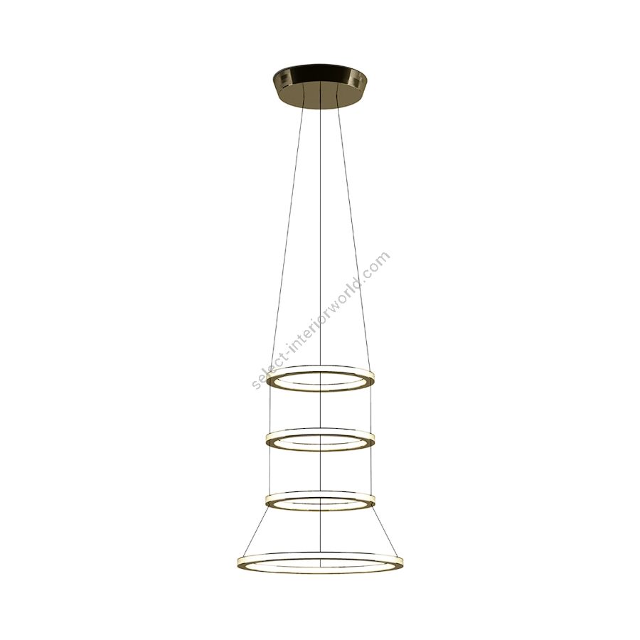 The set of suspension luminaires is a work composed of metal rings, adorned with brass details. Each ring contains an opaline acrylic diffuser both on the outside and inside, allowing for uniform diffusion of a warm, integrated LED light source. This meticulous composition offers exceptional versatility: by combining the five different ring diameters, a wide range of possible volumes and shapes are displayed.