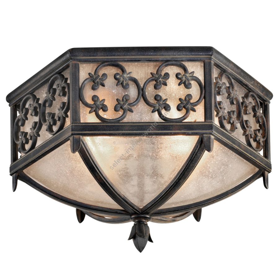 Flush mount in stylized quatrefoil design features Marbella wrought iron finish and subtle iridescent textured glass.
