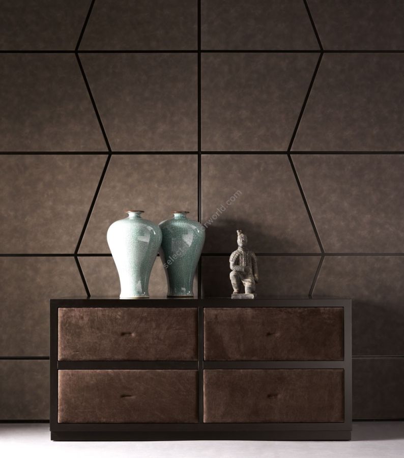 Zenit wall panels allows to create elegant decorative walls to be integrated with the modular storage units of the Zenit wall units program. Panels are made of wood and are rounded-off with metal frames. Panels and metal frames can be finished in all the proposal of the wide sample set, can be upholstered in leather or eco-leather or veneered in Canaletto walnut or sand blasted oak. The program can also accept some other material on the choice of the architect.