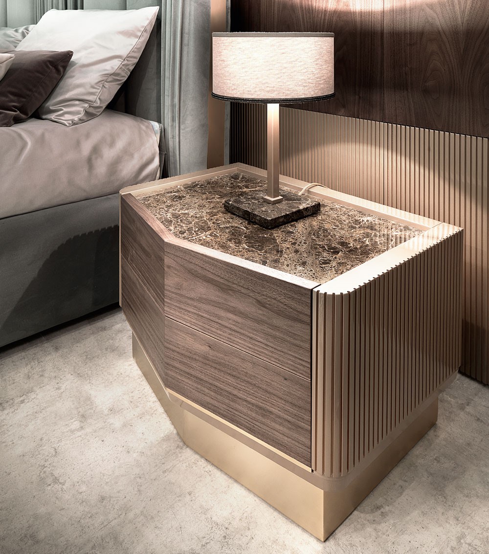 | Drawers and top in plywood veneered in canaletto walnut or mdf and lacquered. Sides in ribbed and lacquered mdf. Top in multilayer wood veneered in canaletto walnut or mdf and lacquered. On request, marble top, to choose in a large sample set Plinth in decorated wood or in iron with galvanic finish. | |