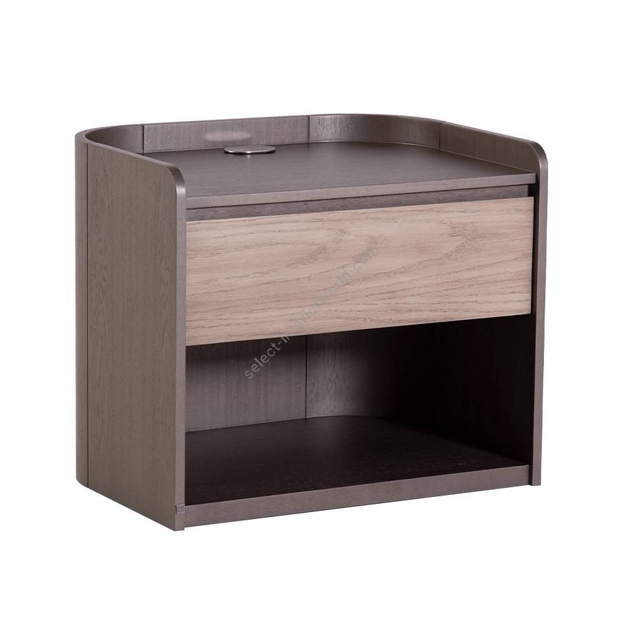 Nightstand with organic shapes, inspired by the silhouette of the wooden boats often spotted in the Galapagos Islands. It has a drawer for storage and includes a new gadget for electrical and USB connectivity.