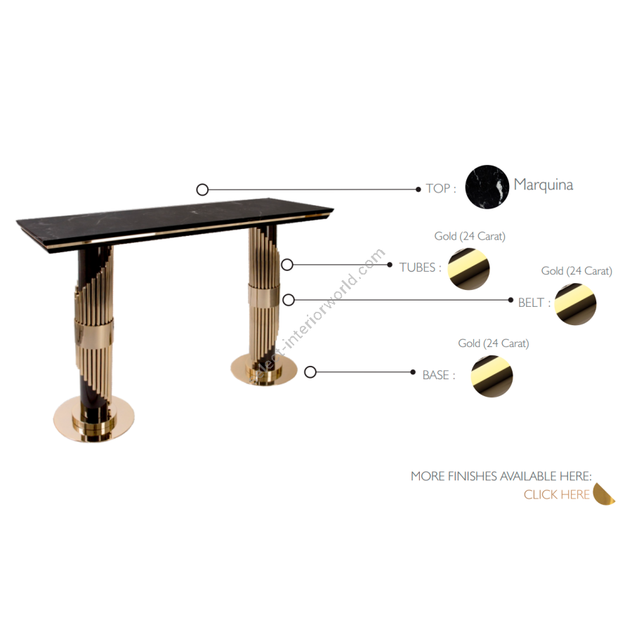 This elegant console features long gold plated brass tubes that give all the designs a whole exclusive and deluxe look, setting another level by their distinctive appearance. This recipe of rich materials, such as the brass and the Black Marquina marble, and sleek lines inspired by art-deco architecture make the Streamline piece desirable.