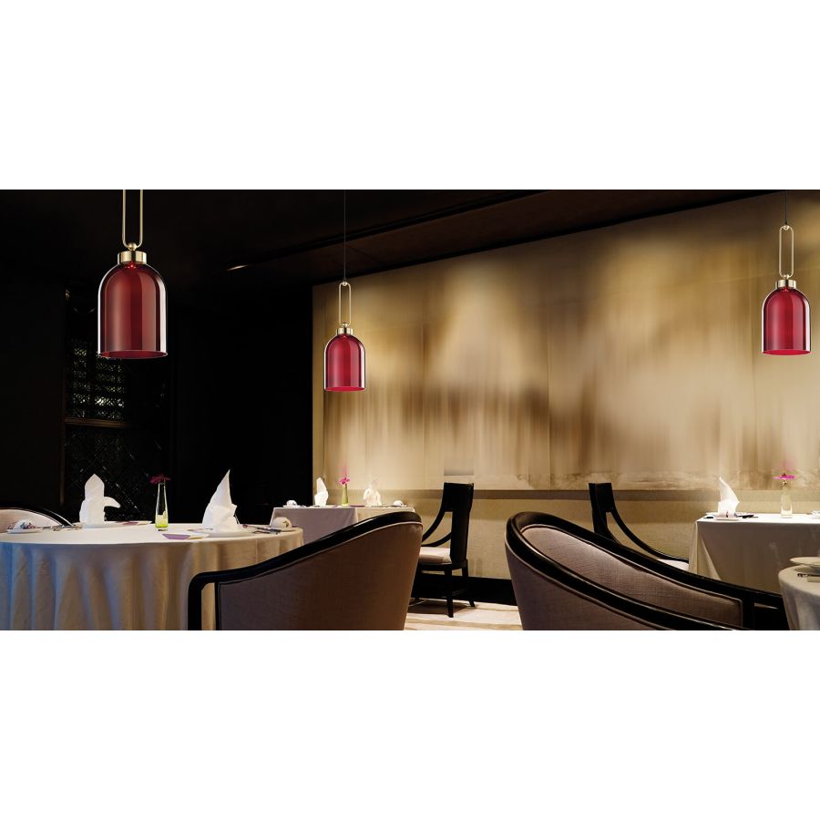 All the elements of the collection are characterized by a blown glass dome diffuser available in red and smoked colors, suspended by a connection with brushed gold or iron grey finish.