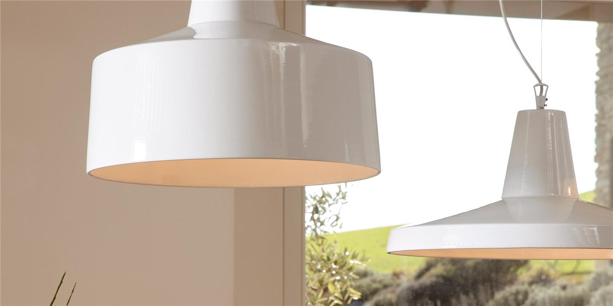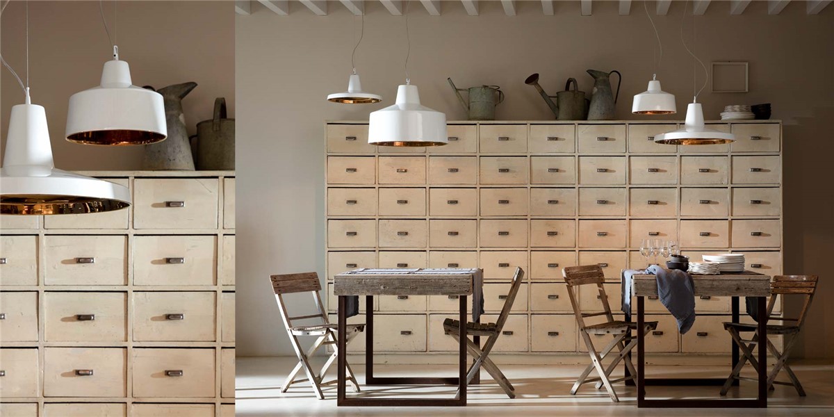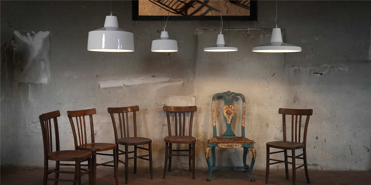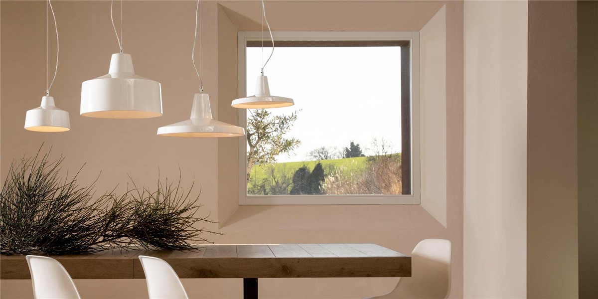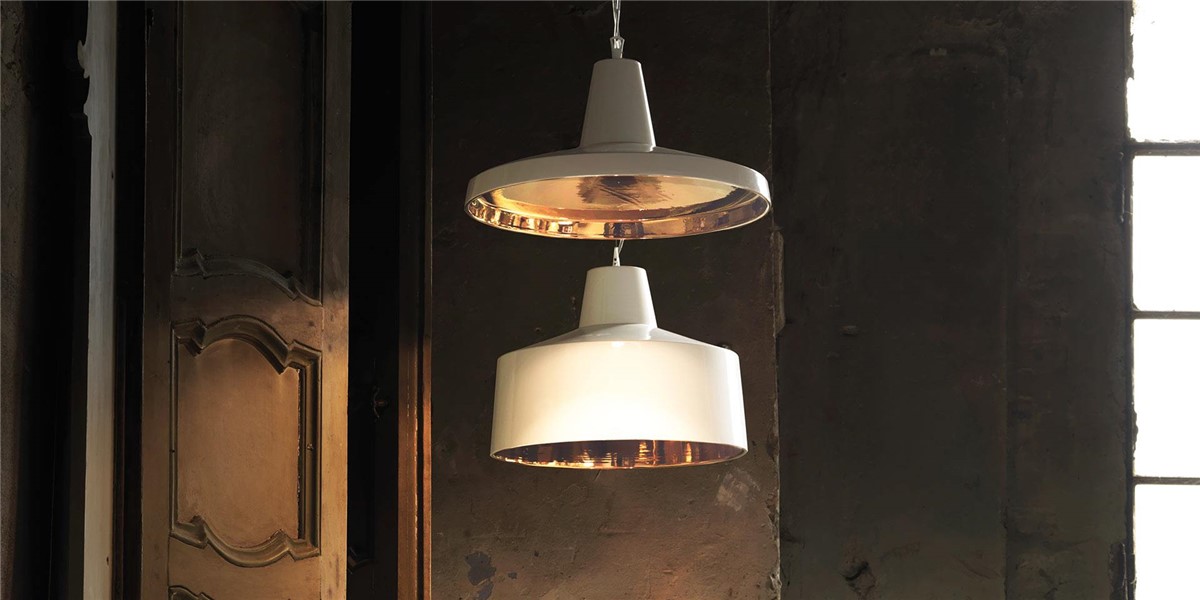 Series of hanging lamps Gangster made of glossy ceramic initially conceptualized in the white and white – bronze versions, with new colors in matt gray and matt green, it creates a fresh and cozy atmosphere.