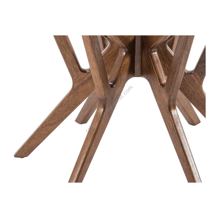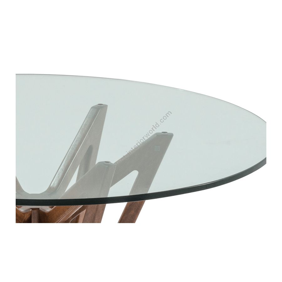 A sculptural approach was used for the design of this dining table. The legs were carefully thought to prioritize the design of meandering curves turning it into a masterpiece. Obsess with the perfection in its movements; this structure is created with important balance traits. The window-like spaces between the base forms convey translucent lightness, while the sturdiness of wood adds the needed stability. An eclectic combination between wood and glass, this table can be customized with a round or squared base.