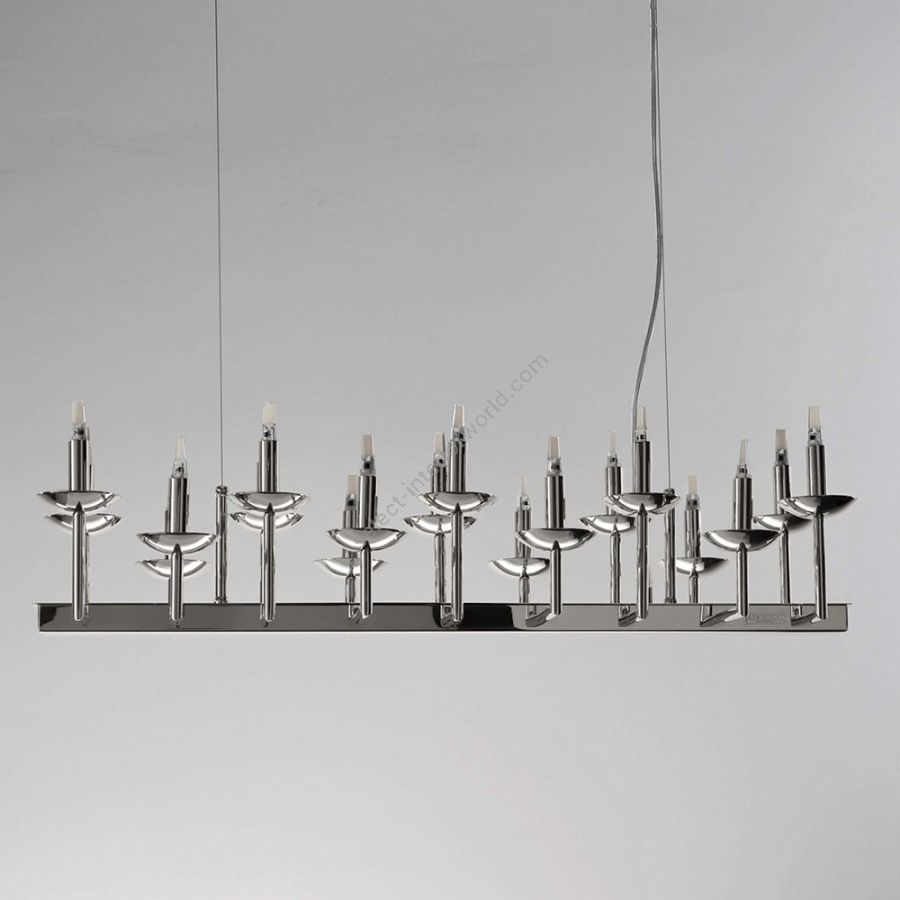 The METROPOLITAN collection, made entirely of brass and small metal parts, is available with or without lampshades and is produced in the following versions: pendant lamps starting from 3 lights up to 18 lights, linear pendant lamps, table lamps, wall lamps, floor lamps and in any further customized version based on specific customer requests. Finally, a wide range of colors of the metal finishes and lampshades available complete the proposal.