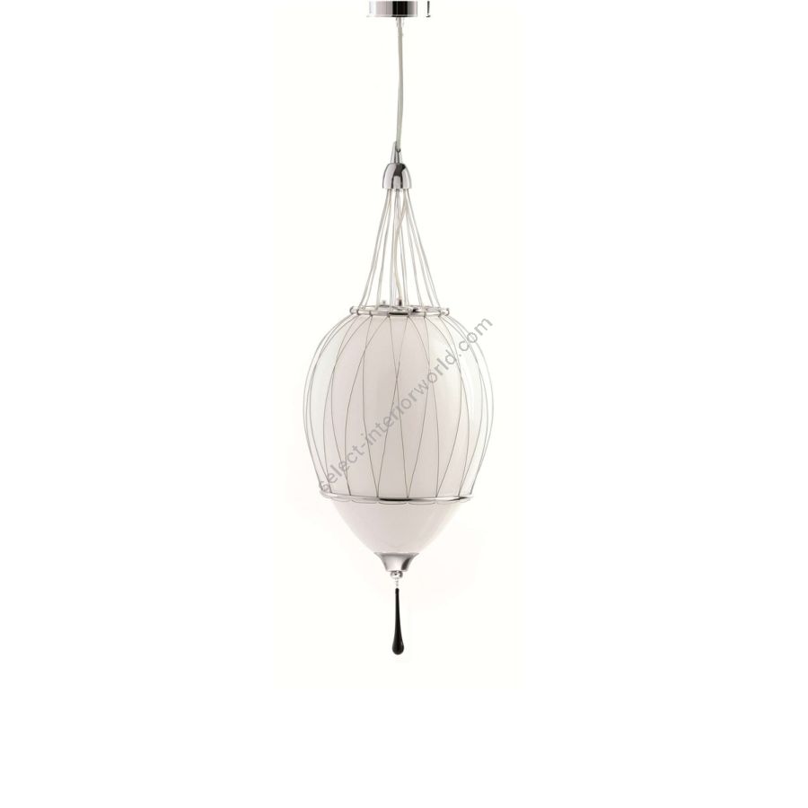 TANGO suspension lamps have a hypnotic design that captivates the eyes fascinated by a inexplicable interweaving of threads and knots made totally by hand that supports an egg blown in original Venetian Murano glass trapped in two rings.