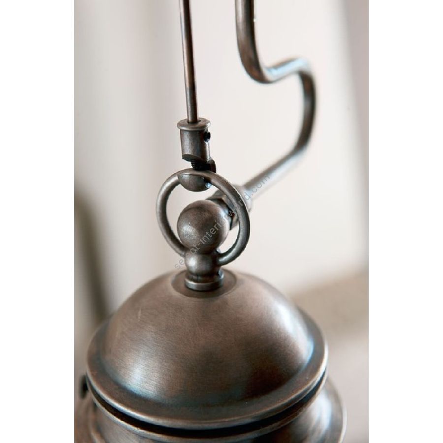 Materials are: cast brass base or ring, copper shade, blown white-milk shiny glass.