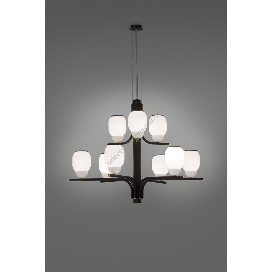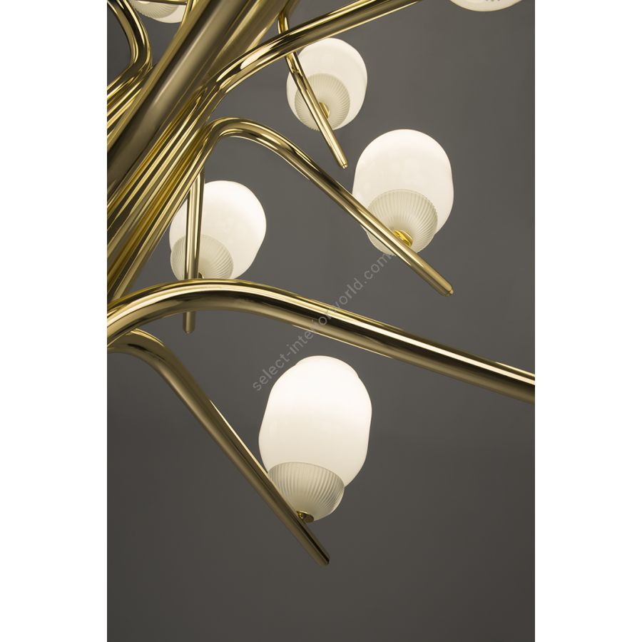 The shades of the THECHANDELIER collection are made of opal glass and can be smooth or grecale-style frosted. The structures are all made of electroplated iron in gloss polished brass finish, or textured painted white or black. The collection, however, is easily customizable in finishes, both metal and glass, to adapt to all types of projects. Inside each shade there is an E27 socket, which will allow the end user to choose the bulbs that best suit their wishes in terms of light temperature, intensity and possibility of dimming.