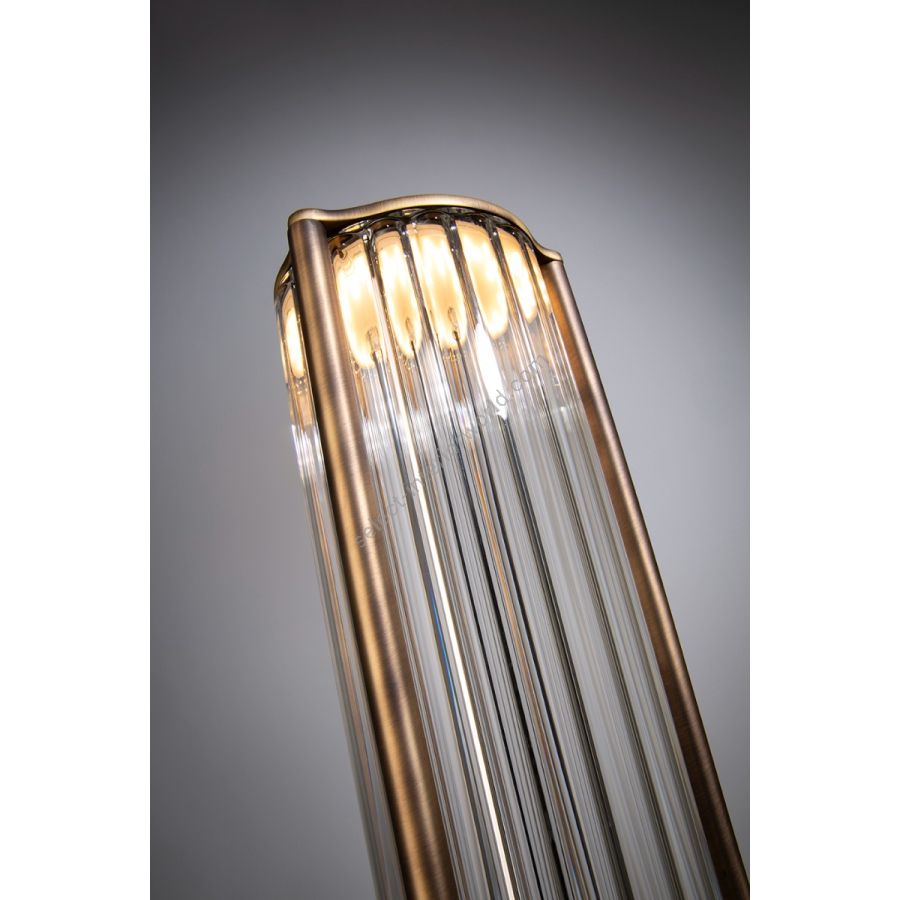 Totem II is 150cm tall. The shade is a transparent fluted borosilicate glass cylinder with a diameter of 12cm. The iron structure is made up of a base, an upper cover and three rods that link both along the glass. It comes in two finishes: textured black painted, and electrolytic bath in satin bronze. The light source is a TRIAC-dimmable 2700K 16W 1520lm LED module. It includes a switch/dimmer.