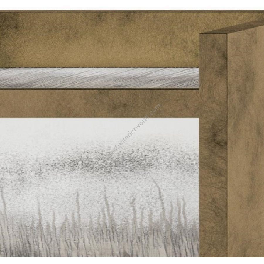 Suspended bedside table with push and pull opening, MDF veneered plywood structure. Wood structure finished in antique brass varnish, 6 mm thick extra-clear acid-etched glass with polished edge finish with diamond grinding wheel engraving on the etched side.