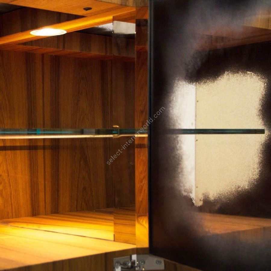 One-piece structure made of shiny stainless steel and antique bronze details. Two lateral doors with push-pull opening.