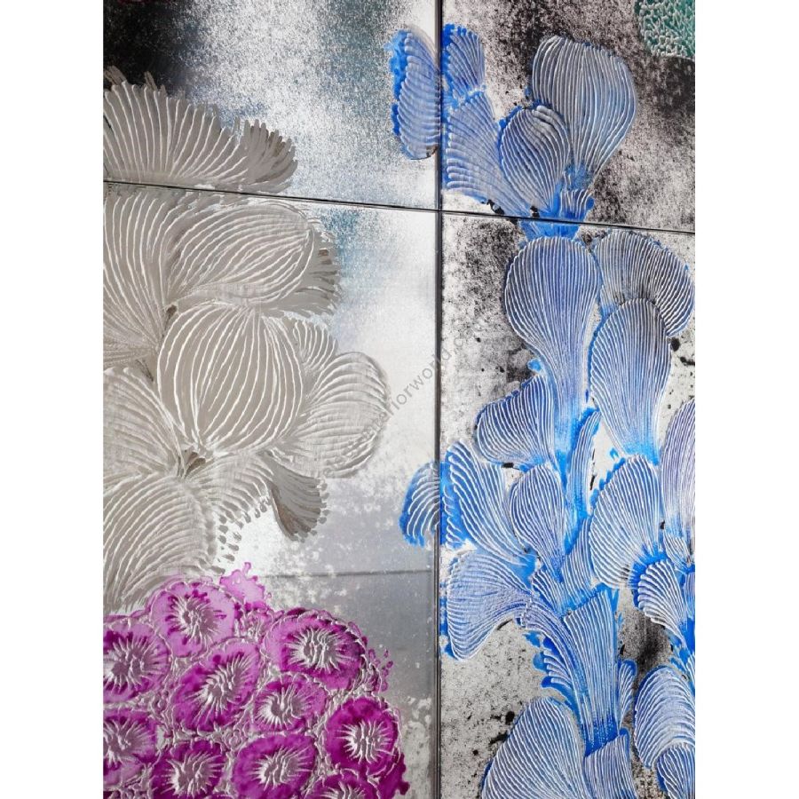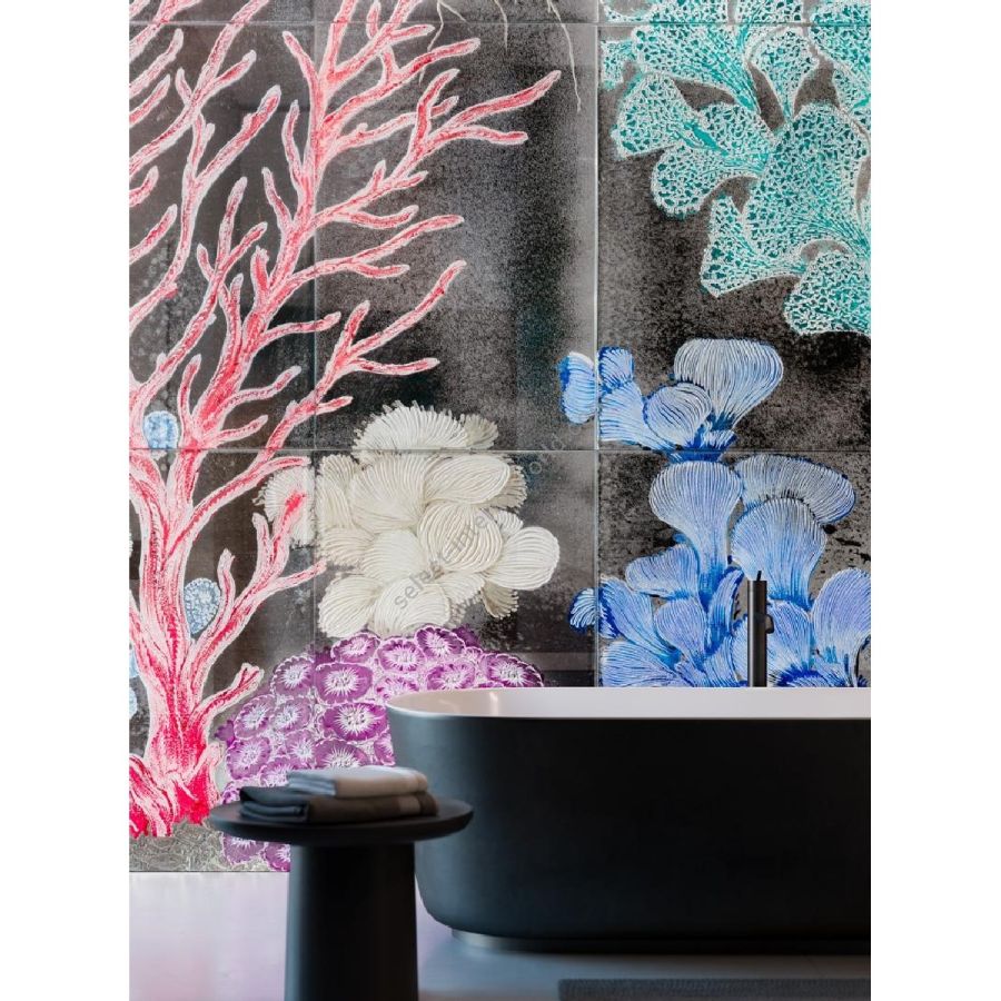 The protagonist of Posidonia is a seabed made with a pen engraving technique with a diamond ball. Algae, corals and anemones are then painted and shaded by hand, while the effect of the ocean depth is obtained by silvering the wall by hand with rare craftsmanship. Each glass panel is pen etched both on the surface and on the back, it is then hand painted and only in the final stage it is silvered with a heavy antique finish.
