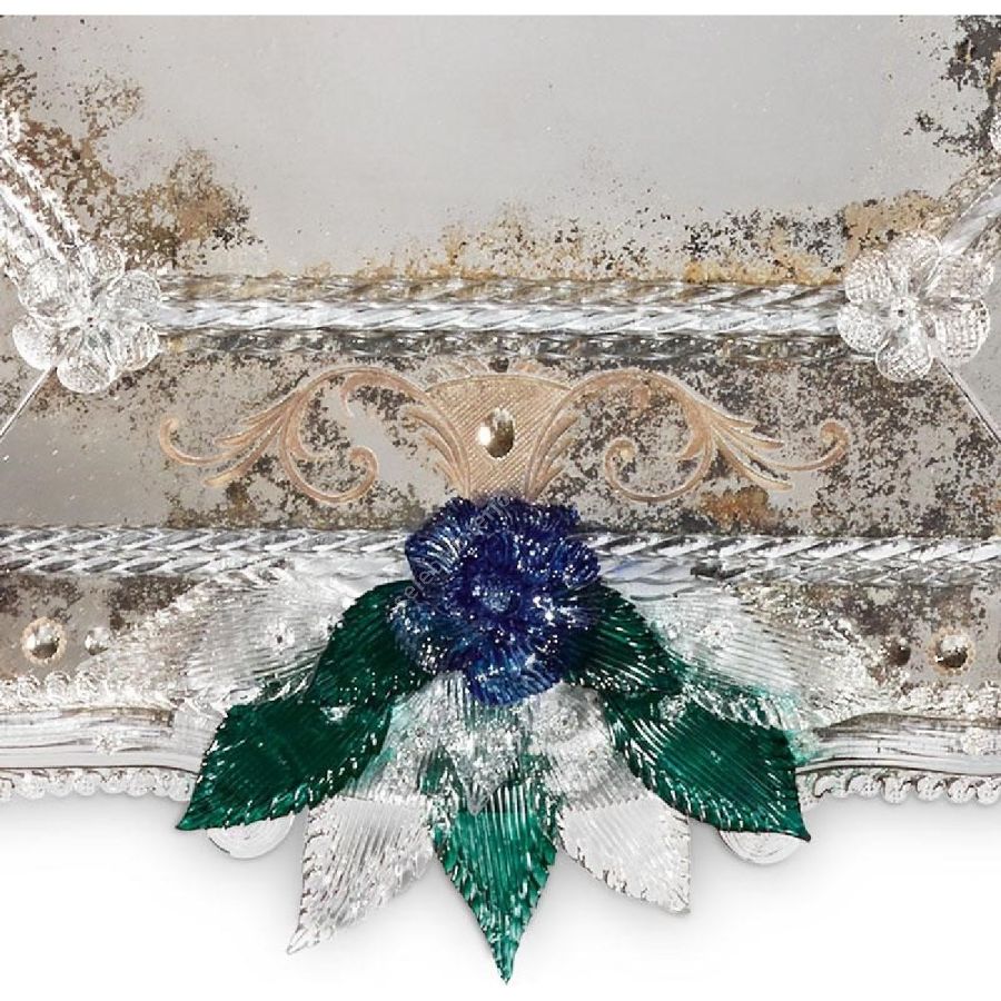 The most famous characters are the typical engraved curl finishings together with the depiction of Bacco, Justice or the well-know Venetian Eighteenth-century . Crystal colored Murano decorative flowers, leaves, twisted ropes and multicoloured glass paste rosettes embellish each Venetian mirror. The result is a unique item comparable to a work of art for craftsmanship and excellence in its execution.