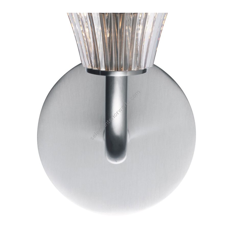 This Mille Nuits tulip wall sconce glimmers whether or not the lamp is illuminated. The flowerbud-like silhouette gradually fans out from the round base. The sconce pivots 180 degrees, directing the glow anywhere between ceiling and floor, with the beveled cuts of the cup enhancing the light-scattering properties all the more. The tulip wall sconce is available in luminous Clear crystal, and Baccarat’s signature red hue. Designed by Mathias for Baccarat, the Mille Nuits collection references the 1001 Tales of The Arabian Nights. The collection also includes other lighting fixtures (from candelabras to chandeliers), as well as bar and tableware (from champagne flutes to dessert plates).