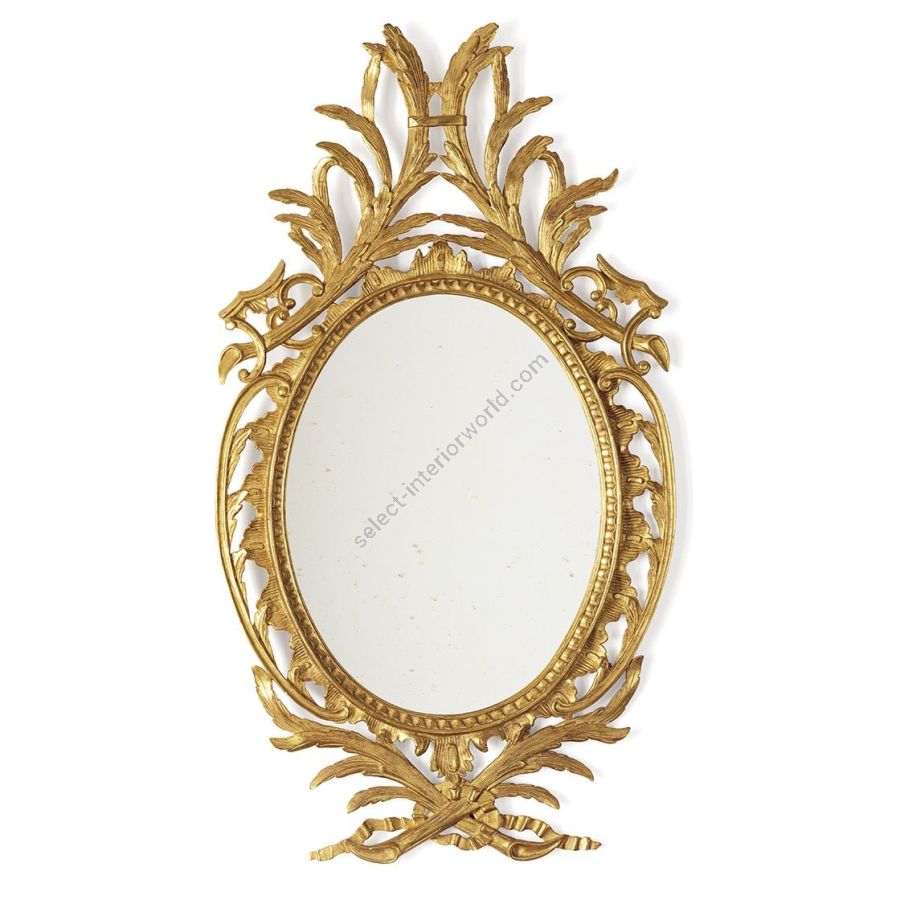 An oval mirror in typical 18th century English style, the Olympus has a beaded oval frame surrounded by freely carved scrolls and foliage.