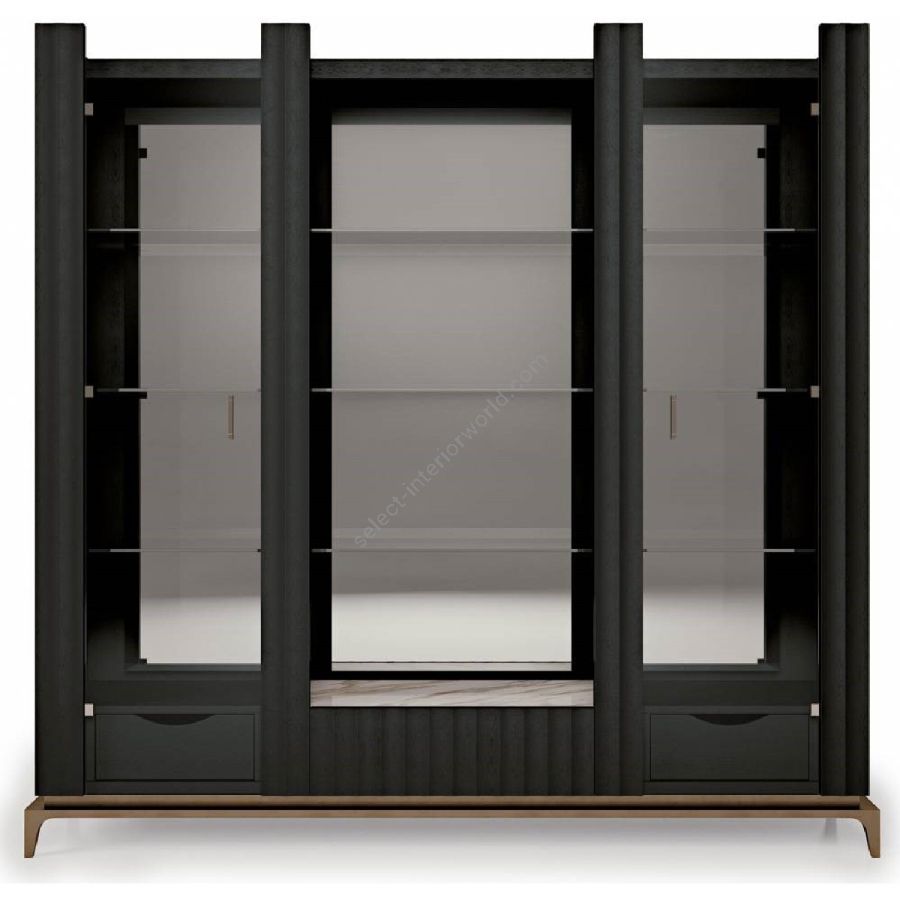 This elegant glass cabinet is crafted from plywood, featuring sides and a drawer in MDF, veneered in an Urban Black Ash finish. The sturdy base in grey-stained Ash wood complements the sophisticated design. A central shelf in exquisite Calacatta Gold marble adds a luxurious touch, while integrated LED lighting enhances the display. Designed by Ezio Bellotti, this piece seamlessly combines refinement with functionality.