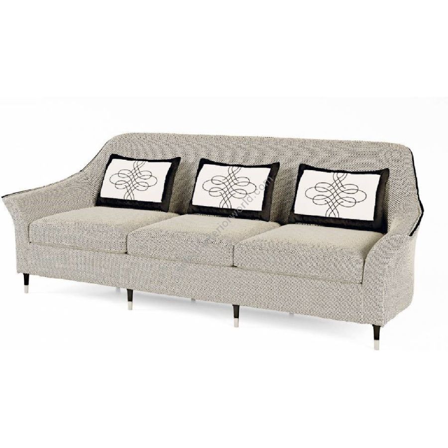 The sofa is elevated by its chromed brass end-feet, adding a contemporary edge to its overall design. These sleek, metallic feet contrast beautifully with the soft fabric and leather, creating a balanced and striking visual. This combination of quality materials and thoughtful design makes the sofa a versatile and timeless choice for any space.
