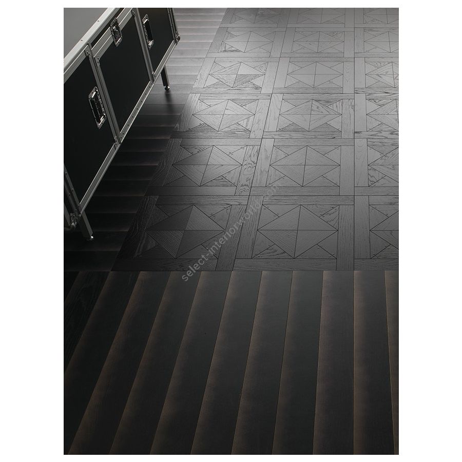 Among the three high-end models of the Stud Tiles series for Diesel Living, which revisit decorative elements in a contemporary key, inspired by the applications of studs and rivets on denim typical of a rock styling, Stud Black is certainly the most iconic. A black parquet of great effect where among the geometric inlays that decorate the wood stand out in contrast the precious metal details that complete the proposal. The quality of a decorative pattern in dark version, consisting of inlaid wooden tiles, which respond to the need to define a refined, bold and atmospheric environment, where the decò trend is combined with an attitude of rock appeal. Stud Black is made of high quality European oak parquet tiles, inlaid according to geometric patterns and worked with deep brushing treatment and color painting.