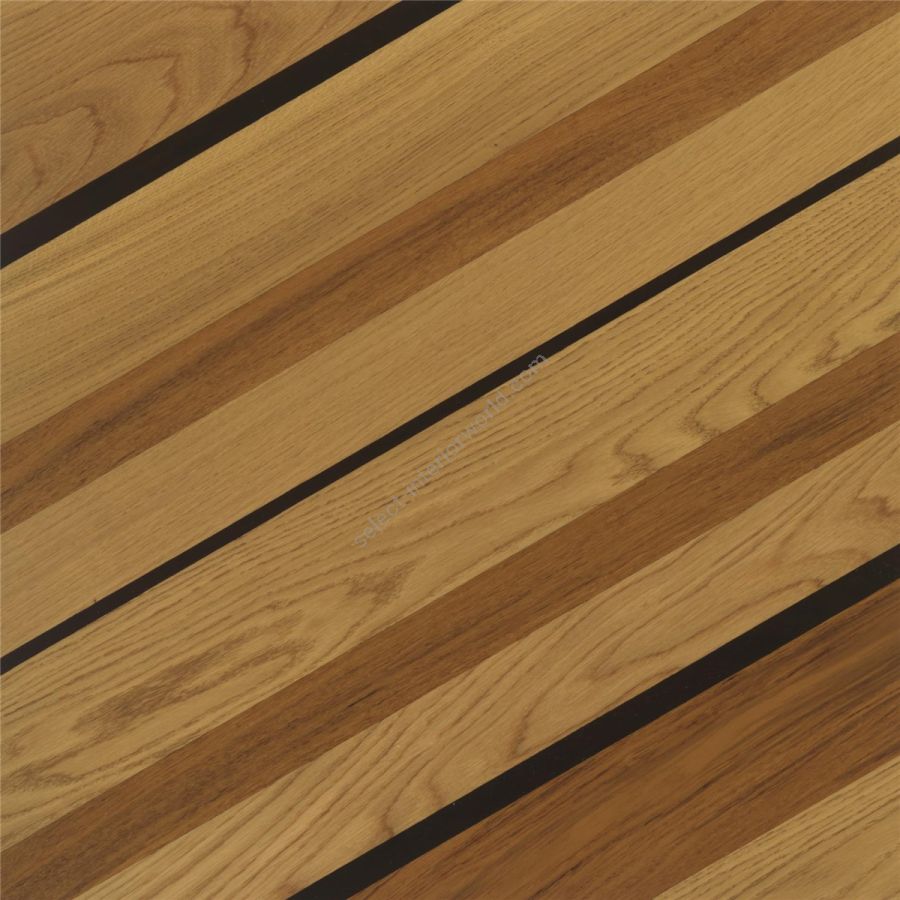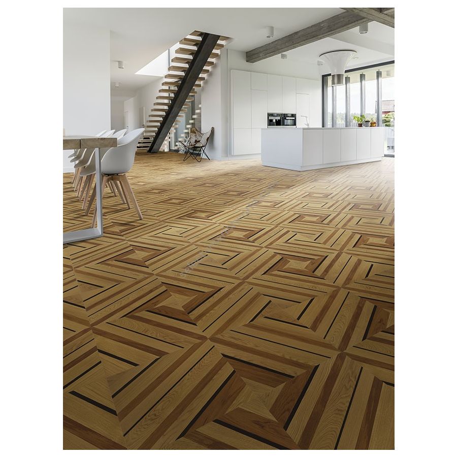 In the pre-finished marquetry parquet Athene tiles, the few features define a pattern in classic style in a modern key. The natural oak colour enhances the precious wood of wenge and teak.
