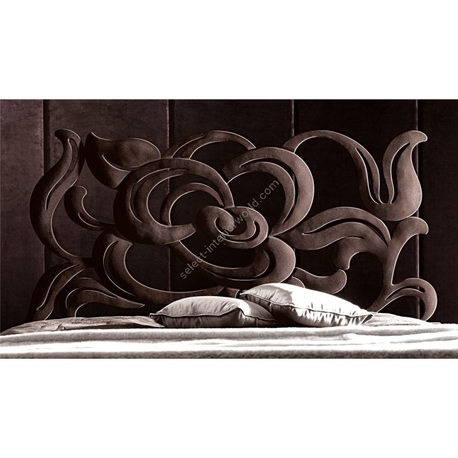A decorative iron bed, with laser cutted wrought- iron bedhead, with three-dimensional effect; the iron bedrail is padded and covered in leather, eco-leather, fabric. The robust thickness of the iron curves, main characteristic of Megan, reminds to sensual roses petals: a great effect, for an unforgettable bed.