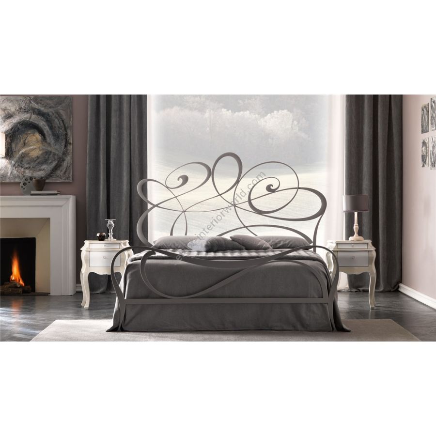A young and romantci bed with bedhead and bedfoot realized in hand-polished laser cutted iron. Twists and curves, aknowledged symbol of the Brand lift up on the centre of the bedhead to create a focus on the manufacturing. Available also without bedfoot and with upholstered bedrail and decorated wooden legs