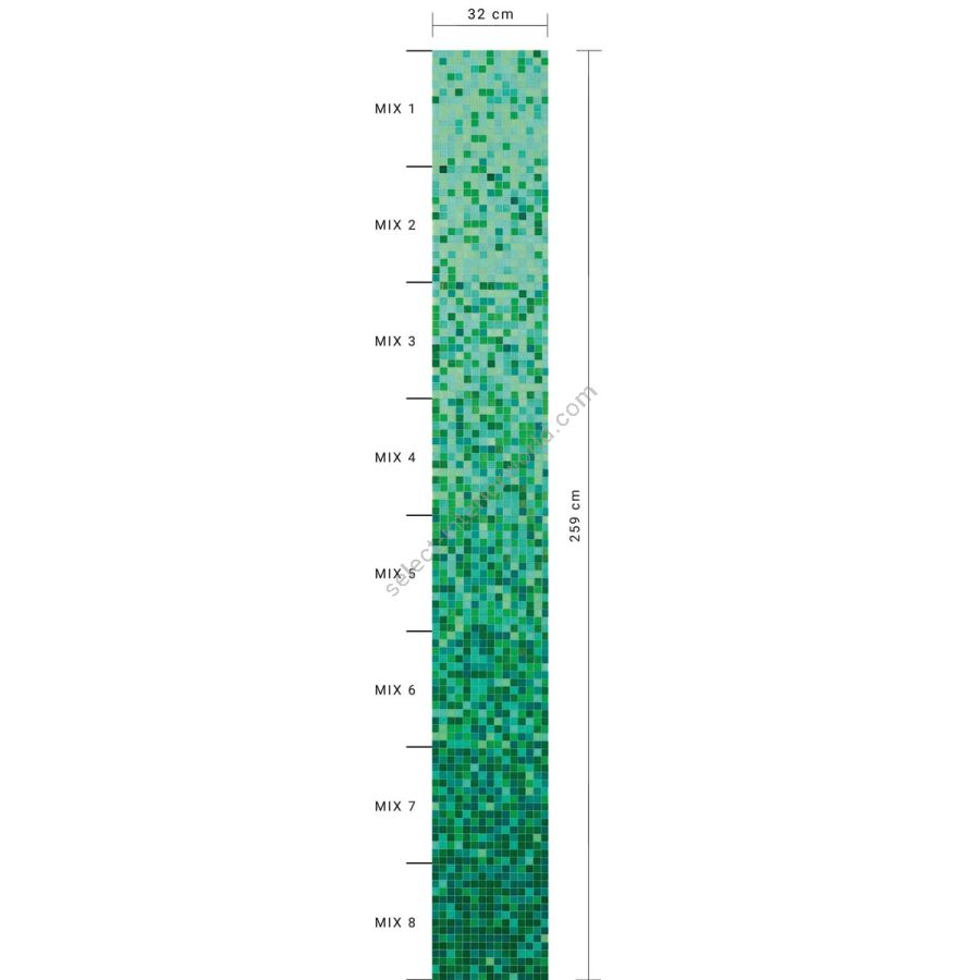 The felce whiteless shading blend is a sequence of mosaic blends arranged in a gradation from light to dark, made with 20x20 mm glass tiles. The shading blend is made up of 8 sheets, with one mix per sheet (mix 1, mix 2, etc.), For an overall height of 259 cm. The individual mixes of the standard shading blends can be sold per sqm. This item is sold by the module. Module dimensions: 0.32x2.588 m (0.83 sq. m). For any customizations, click on “Request information”.