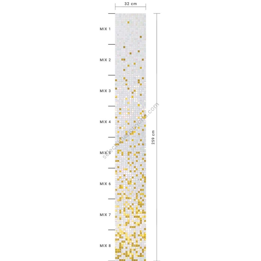 The narciso oro giallo shading blend is a sequence of mosaic blends arranged in a gradation from light to dark, made with 20x20 mm glass and yellow gold tiles. The shading blend is made up of 8 sheets, with one mix per sheet (mix 1, mix 2, etc.), For an overall height of 259 cm. The individual mixes of the standard shading blends can be sold per sqm. This item is sold by the module. Module dimensions: 0.32x2.588 m (0.83 sq. m). For any customizations, click on “Request information”.