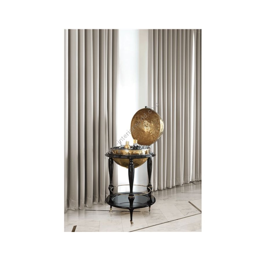Globe made from polished brass, manually hammered. Its legs and bottom head are made from wood lacquered in black with a high gloss varnish. In its interior there is space for glasses and bottles. The surface of the bottom head’s base is made from black lacquered glass.