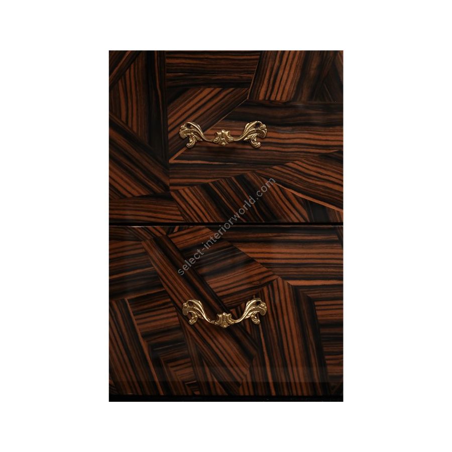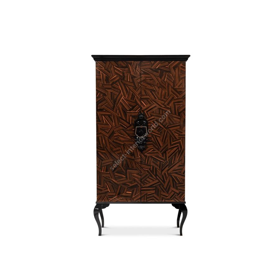 Base: handcrafted mahogany wood with a high gloss varnish finish. Book matched wood veneer of rosewood finished with a high gloss varnish. Body/Legs: High gloss colored lacquer in black or white. Doors and drawers of ebony veneer finished with a high gloss varnish. Brass handles, Glass shelves. The interior’s back is lined with mirror that contains polished ornaments in the glass