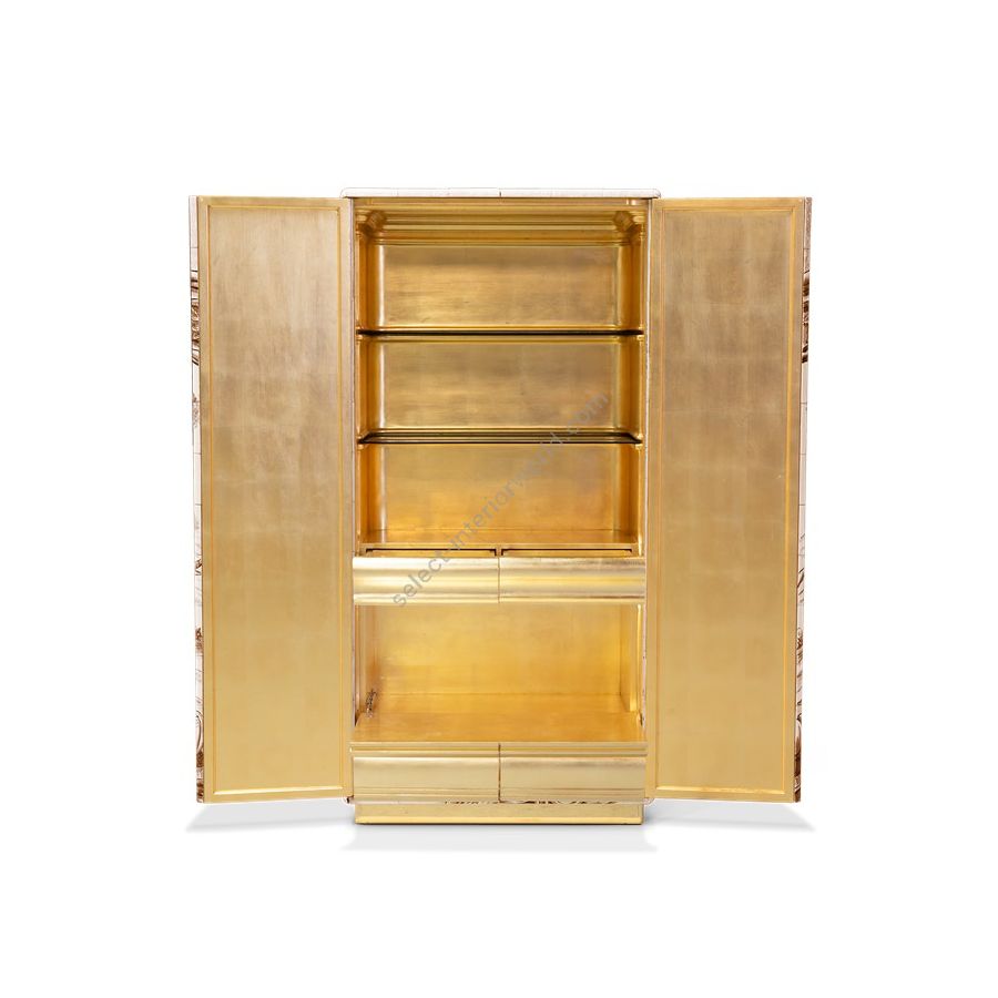 The Heritage Cabinet is a magnificent journey through Portuguese legacy. Covered in Azulejos, traditional hand painted tiles and one of the most representative art forms of Portuguese culture, the architectural cabinet portrays different scenes from the country’s Discoveries era. Centuries of history are gathered in a single final panel, and each layer is enhanced by vertical mirrors on the lateral surfaces. The hint of wander through the rich legacy continues when two doors open to a lined glossy gold leaf interior, and a classical ornament trim reminds the inside of churches and rich buildings. A clear glass shelve can be seen on the two individual divisions of the sideboard. A statement cabinet, the Heritage can take center stage in the most elegant rooms since its back is also fully hand painted. A lengthy tradition of bespoke and exclusivity to make one-of-kind design pieces.