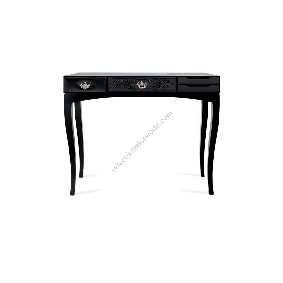 This console bases is made from wood and tempered glass and 5 drawers compose it. Its base is made in lacquered wood. It contains drawers with: handcrafted fronts lacquered in white; fronts made in maquetry and brass handles; fronts with golden leaf and fronts lacquered in blue.
