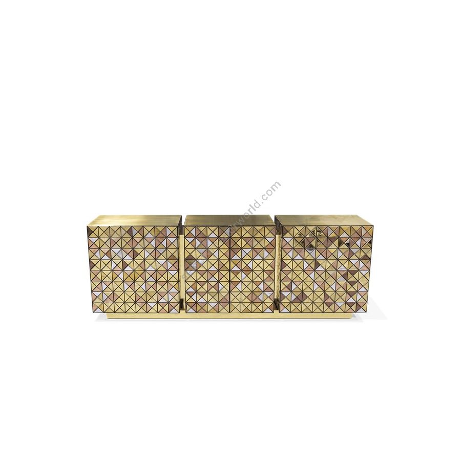 Double-sided sideboard with three doors covered by triangles made from anodized aluminum. Different tones of stainless steel in gold, copper and silver; with brushed and polished finishes.