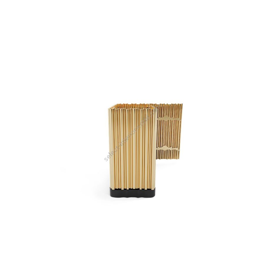This buffet presents a strong wood body enveloped in a tubular cluster of either gold or nickel plated brass tubes, where each door is carefully welded with cutting edge-technology. A harmonious artful juxtaposition that adds rhythm and sophistication to any space. Symphony is wrapped up by a strong black lacquered base, while the top is finished in opaque black glass.
