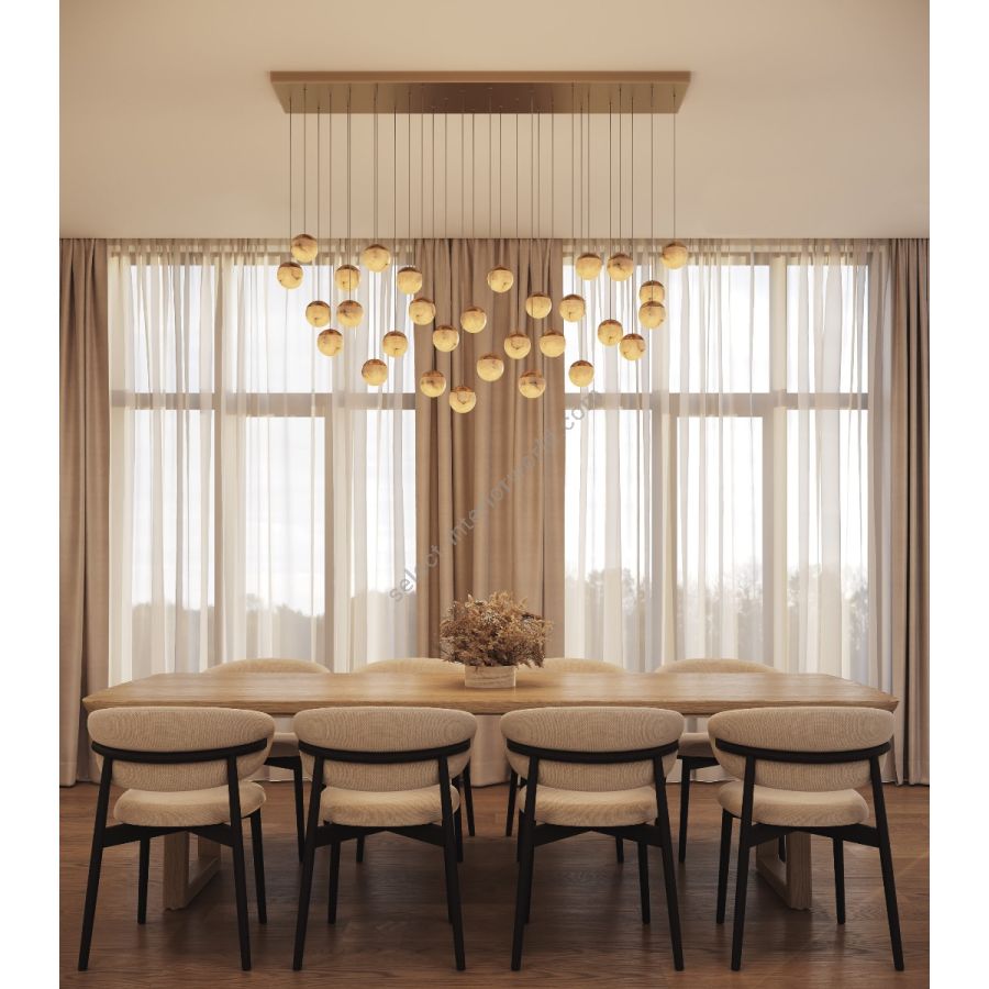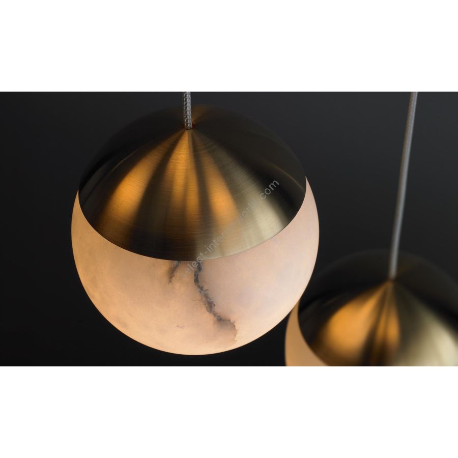 The Callisto Linear fixture features brass and alabaster moons that cascade through your interiors. Each alabaster sphere is hand carved, featuring a unique pattern and natural beauty. There are three lengths; 36″ / 48″ / 60″ versions. Designed by Boyd Studios. The Callisto Linear can be modified for different lengths and widths to suit the needs of your space.