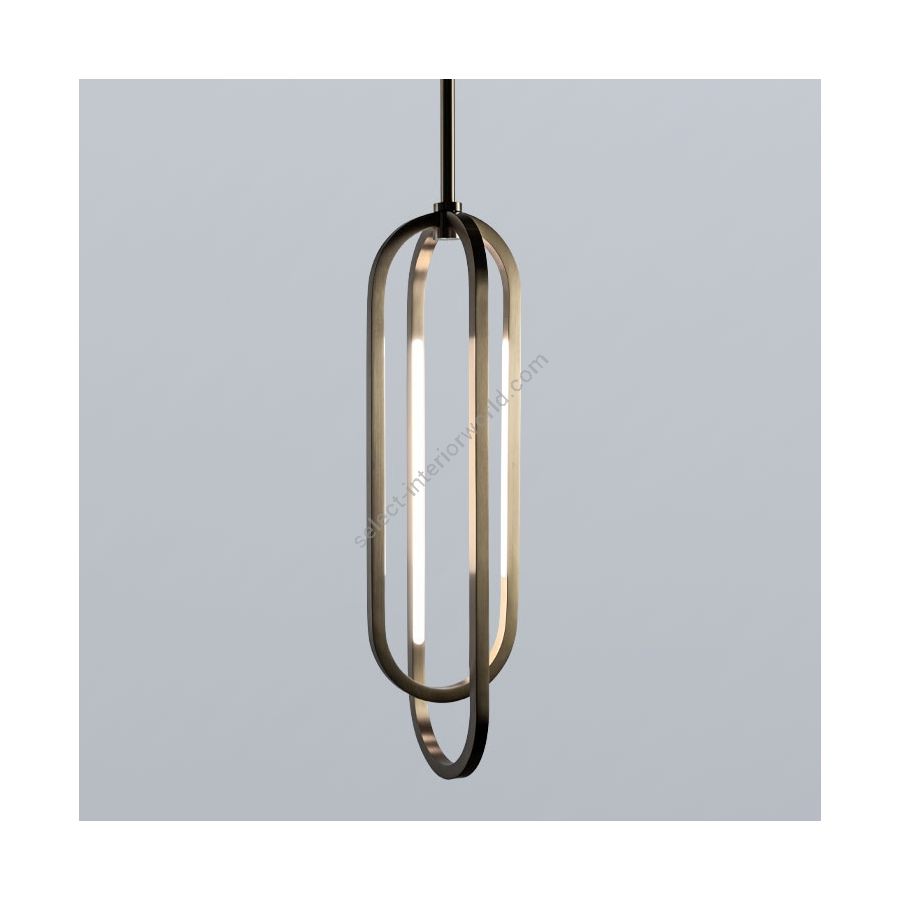 A thin profile brings airiness and minimalism to this elegant series of pendants designed by Doyle Crosby. Square tubes of hand-finished brass form geometric crisscrossing double obround loops that illuminate from within satin white diffusers.