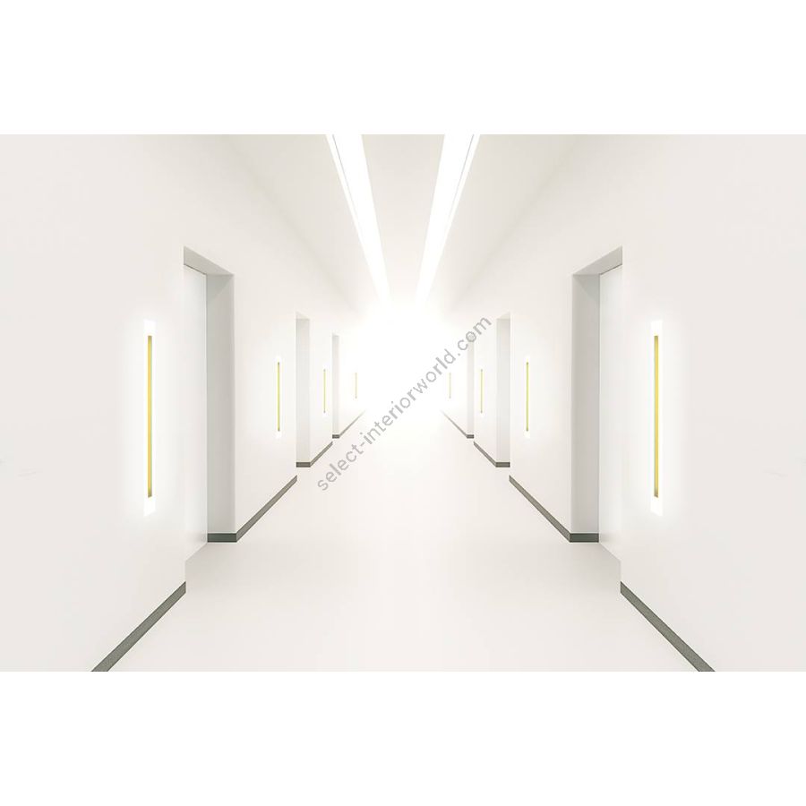 The linear, in-wall Sunbeam Sconce features a narrow channel that runs lengthwise down its middle. The inner reflector is available in gold or white gold paint, or white or yellow gold leaf, and the outer frame is available in white primer so it can be painted to match the wall color. With its subtle sparkle, a row of these dimmable sconces lining a corridor would make a big impact. Recessed mount. Can be mounted vertical or horizontal.