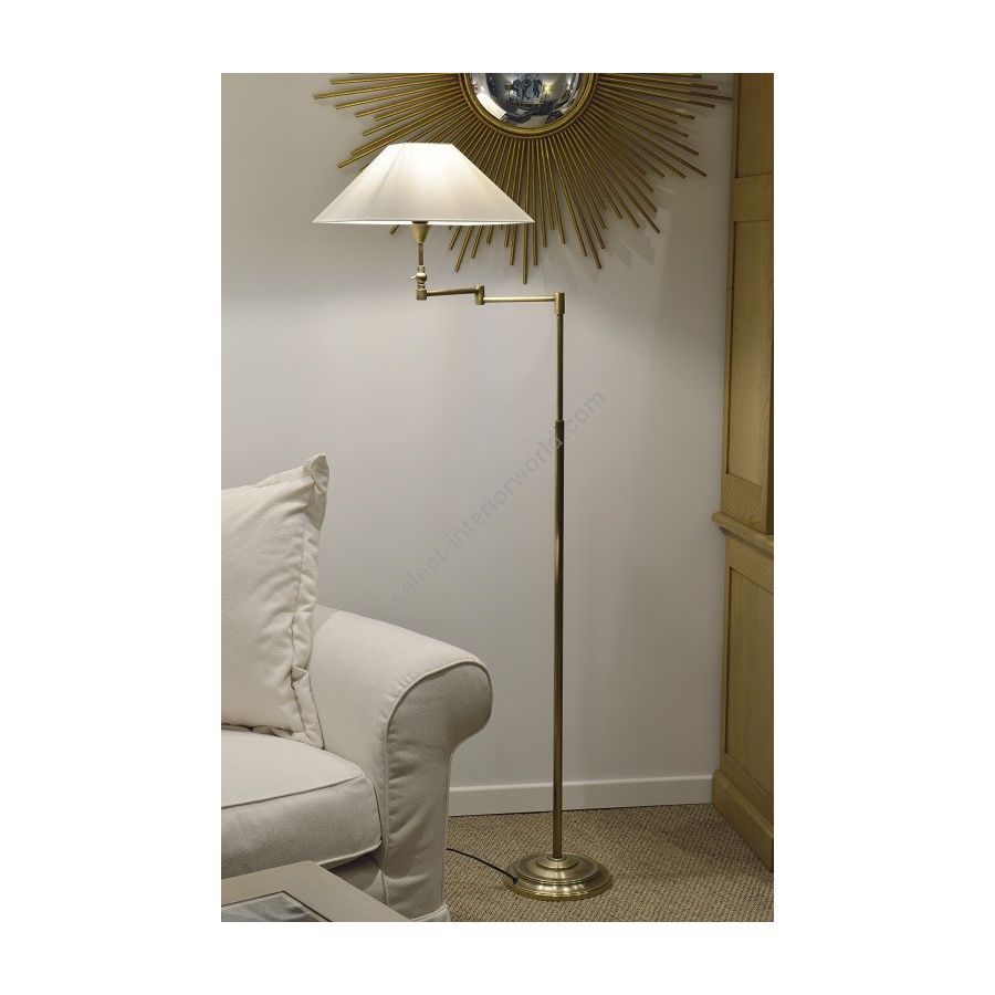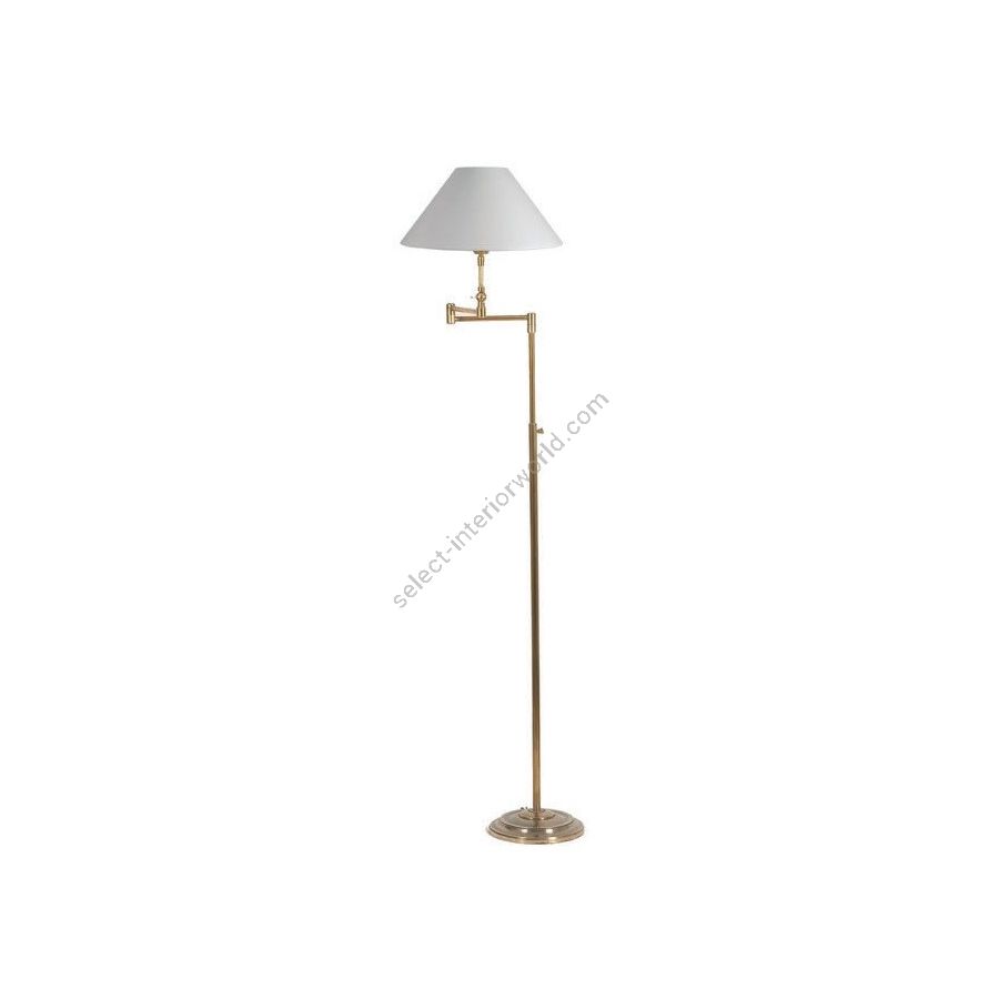 Floor lamp in brass. Made with a ajustable round tube with a swing arm, on a round base. This classical floor lamp gives a deported lighting thanks to its adjustable tube and its swing arm. Available in black or matt gold patina. Presented lamp shade in white cotton chintz in a conical shape (see other available shapes and colours).