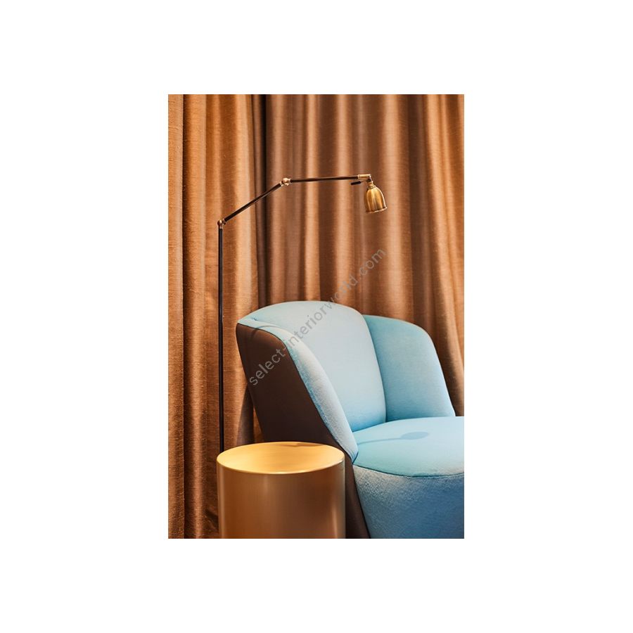 Floor lamp in brass. Made with a round tube with a double pivoting arm on a round base, with a pivoting reflector. This elegant floor reading lamp gives an efficient direct lighting. Available in black or bicolor (black and matt gold) patina.