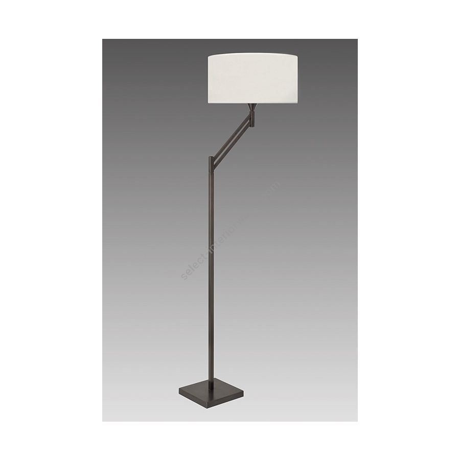 Floor lamp in brass. Made with a square tube on a square base, diagonally extended by a double square tube, horizontally pivoting. This contemporary floor lamp gives a touch of elegance to your interior. Available in black patina. Presented lamp shade in beige striated chintz in a cylindrical upright shape (see other available shapes and colours).