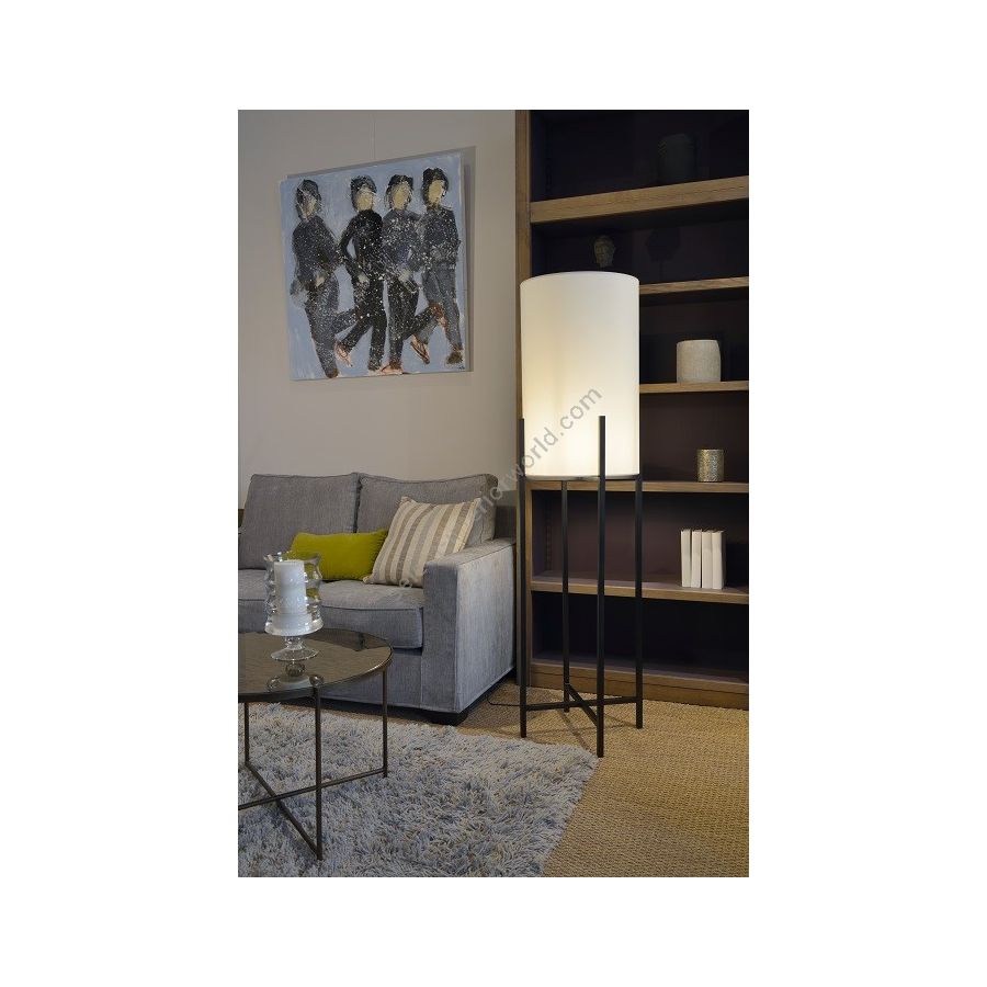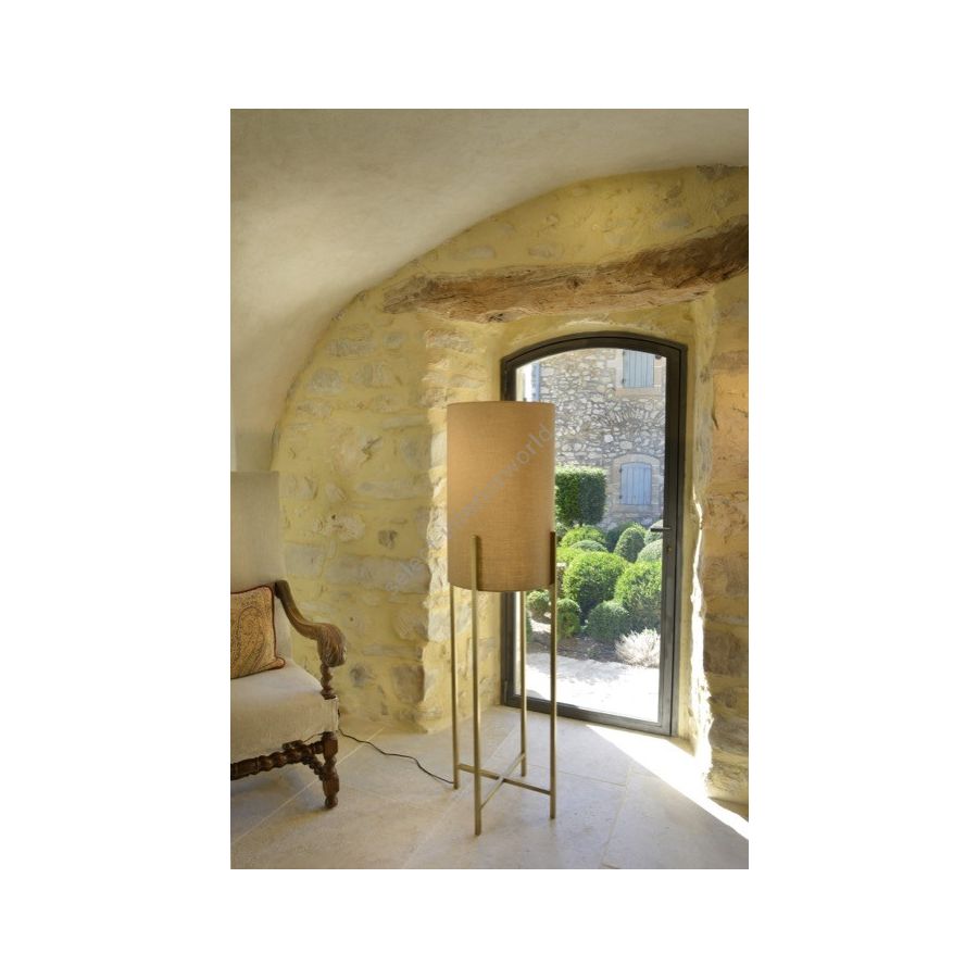 Floor lamp in brass. Made with 4 vertical square tubes, joined in their middle by 2 crossed tubes. This contemporary floor lamp gives an original design to your interior. Available in black or matt gold patina. Presented lamp shade in white cotton chintz in a cylindrical shape (see other available colours).