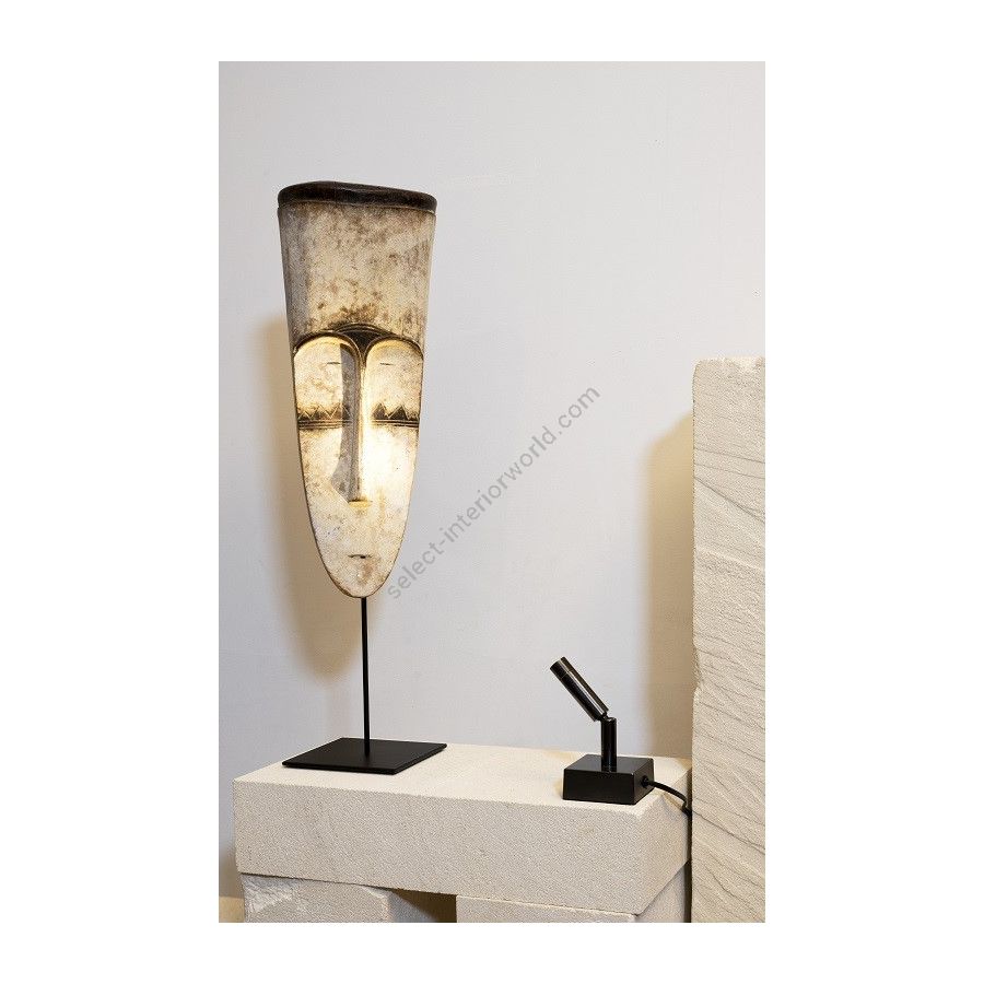 Table spot made in brass It is made with a cylindrical led light on a square base This table spot with a sober and elegant design highlights a painting, a sculpture, a furniture Available in black or matt gold patina.
