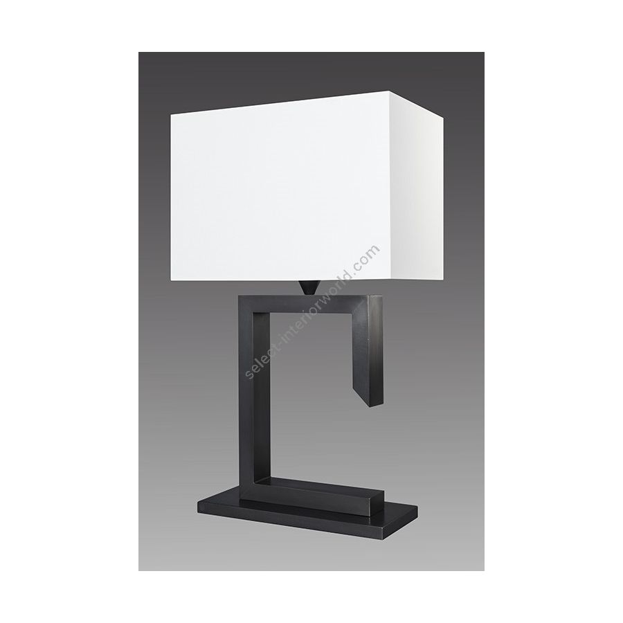 Lamp made in brass. Made with a truncated 'C' shape rectangular frame, as Casadisagne, on a rectangular base. This contemporary lamp gives an original design to your interior. Available in black and matt gold patina. Presented lamp shade in white cotton chintz in a rectangular shape (see other available colours)