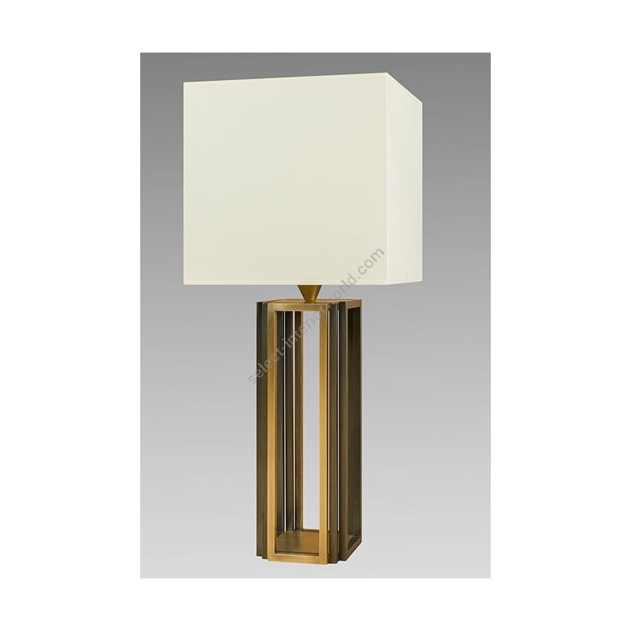 Table lamp made in brass. It is made with 4 sides, each with bicolor layered rectangles. This lamp, which is definitely contemporary and represents a wonderful sculpture work, magnificently decorates your interior. AVailable in bicolor black and matt gold patina. Presented lamp shade in white cotton chintz in a square shape (see other shapes and other available colours)