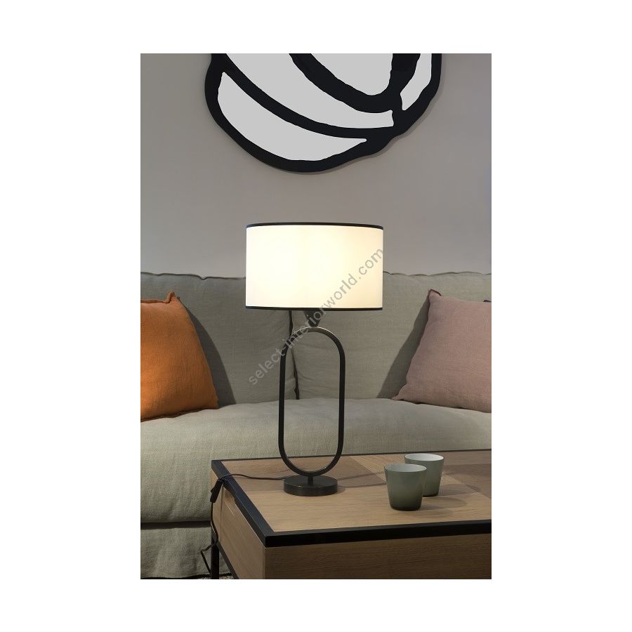 Table lamp made in brass It is made with a square tube forming an harmonious oval on a round base This lamp with an elegant design nicely decorates a living room, a bedroom or an office Available in black or matt gold patina Also available in larger size (L203B) Presented cylindrical shade in white cream chintz (see other available colors)