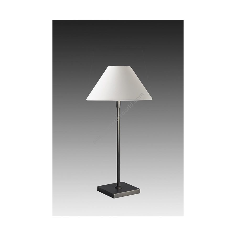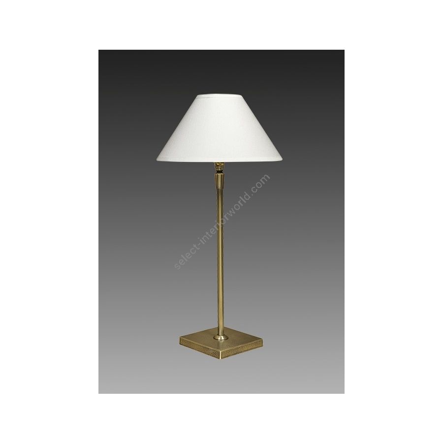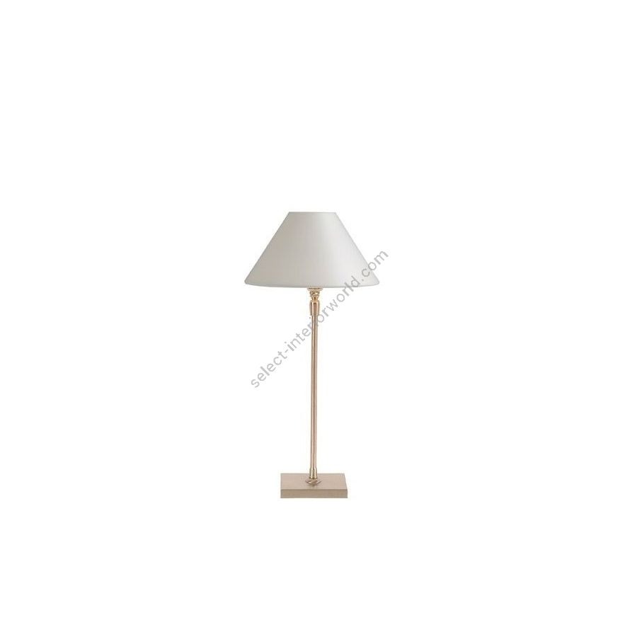 Lamp made in brass. Made with a round tube on a square base. This contemporary lamp discretely decorates your interior. Available in black or matt gold patina, and in nickel or brushed nickel. Also exists in medium (L20E) or in large size (L20F). Presented lamp shade in white cotton chintz in a conical shape (see other available shapes and colours)