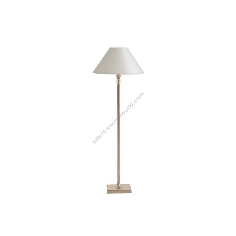 Lamp made in brass. Made with a round tube on a square base. This contemporary lamp discretely decorates your interior. Available in black or matt gold patina, and in nickel or brushed nickel. Also exists in small (L20D) or in medium size (L20E). Presented lamp shade in white cotton chintz in a conical shape (see other available shapes and colours)